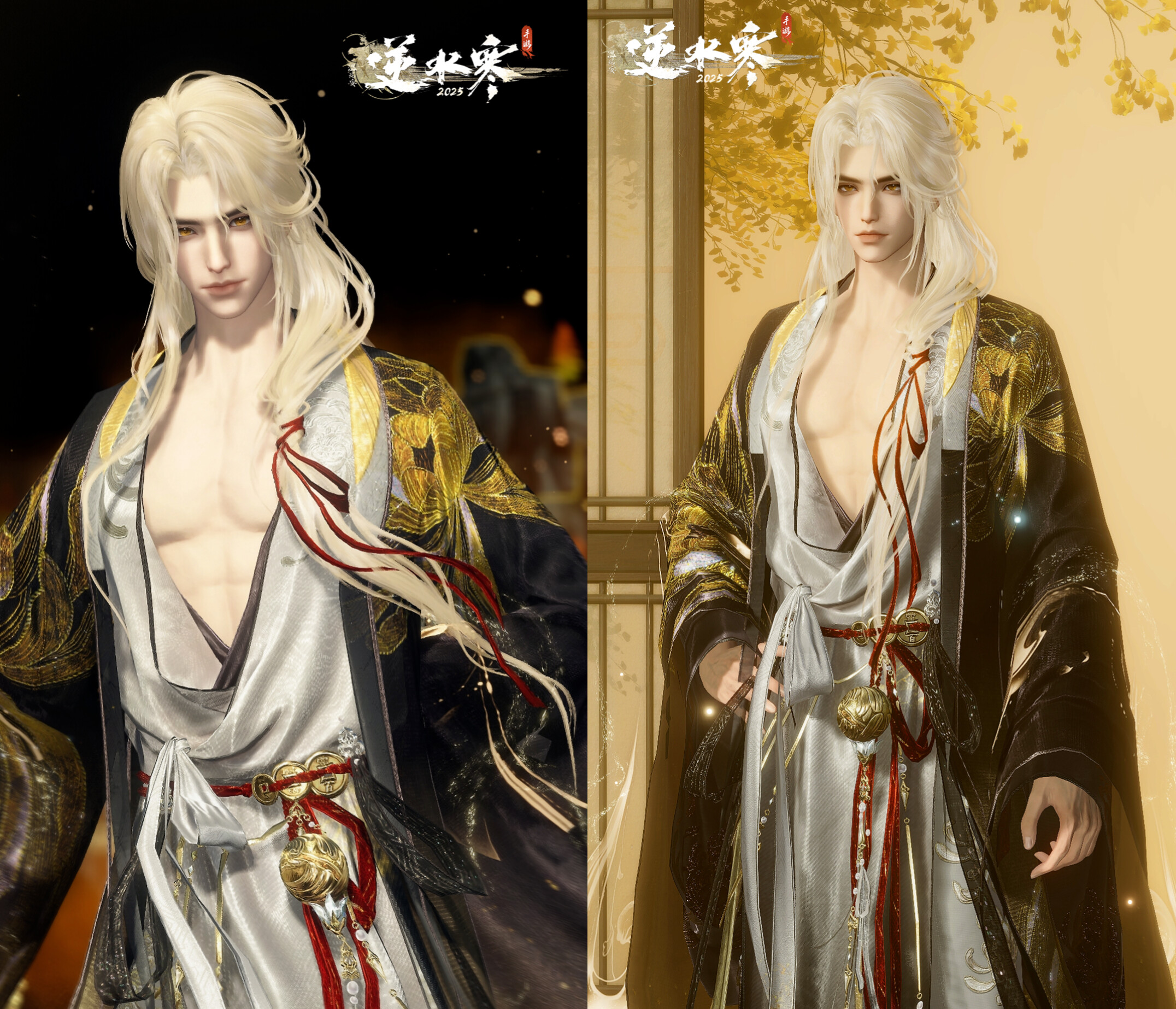 【玉华拈香】男款时装则尽显风流倜傥姿态,松散敞开的领口设计并非刻意的不羁,而是如名士焚香时心境的旷达与洒脱,可轻松揽得烟霞满襟。月白色内衬搭配墨色外袍,黑白相衬尽显古意十足;在时装的领口、袖口处,都以金线绣出菊瓣花影,暗合古人啖菊焚香的风雅之举。