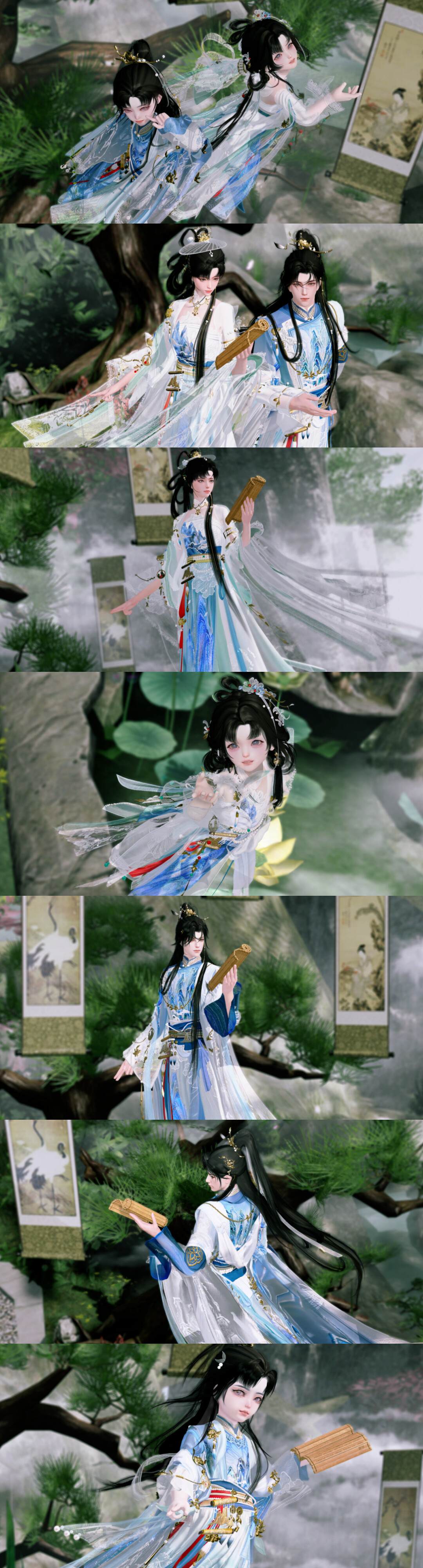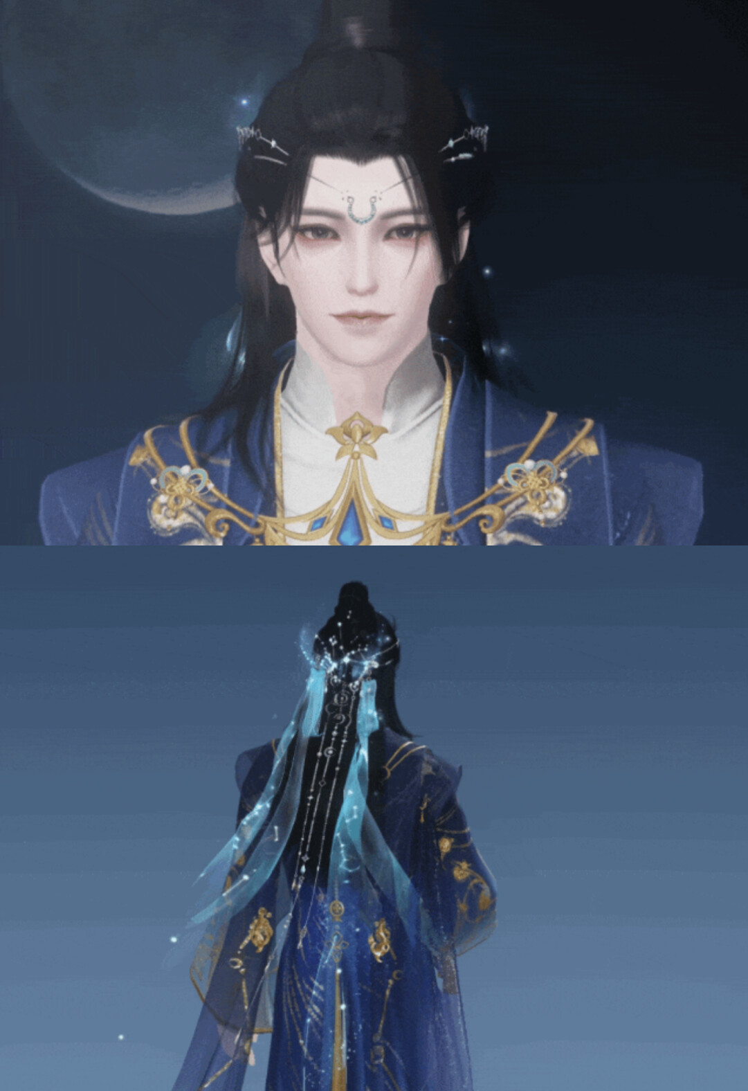 男款时装广袖半裁湛蓝若蘸碧空,衣袍铺陈水墨意境,金线勾出云纹如笔势飞白,书写“奇真绘墨”道劲风骨,腰间玉卷横悬,佩饰鸣响似砚池轻叩。袖缘蓝纱恍若笔仙挥墨时荡开的千秋浩气。风动衣扬时,天地山河皆入衣袍皱褶。