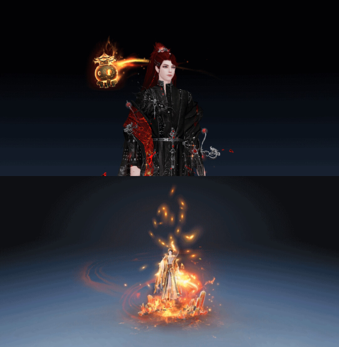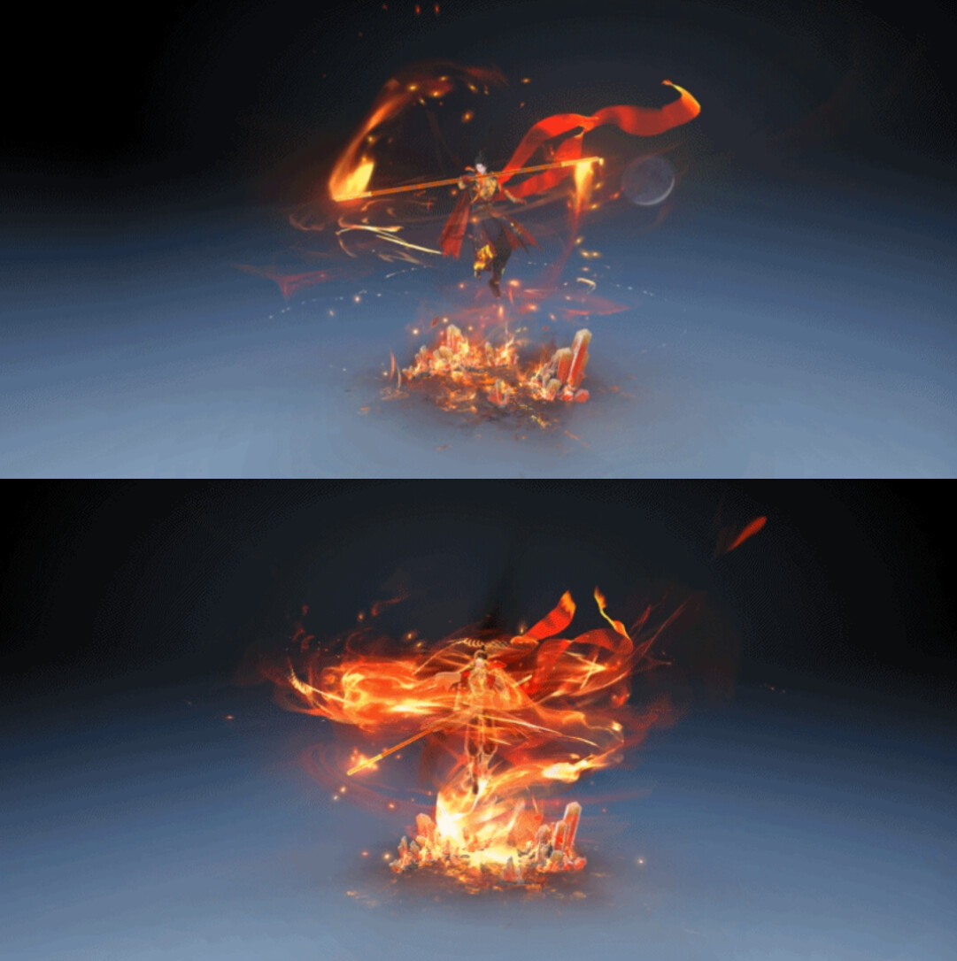 特效高潮之时将化身入圣:一袭赤色披风猎猎如血旗翻飞,在火海中得以窥见那道凛然魄影。周身火莲绽裂如红霓碎穹,灰烬纷飞处星火重聚,恍若凤凰涅槃、悟空破炉——每一缕焰光皆是新生,每一息灼热皆为道鸣。特效结束后,亦有火眼金睛效果残留于眼中。