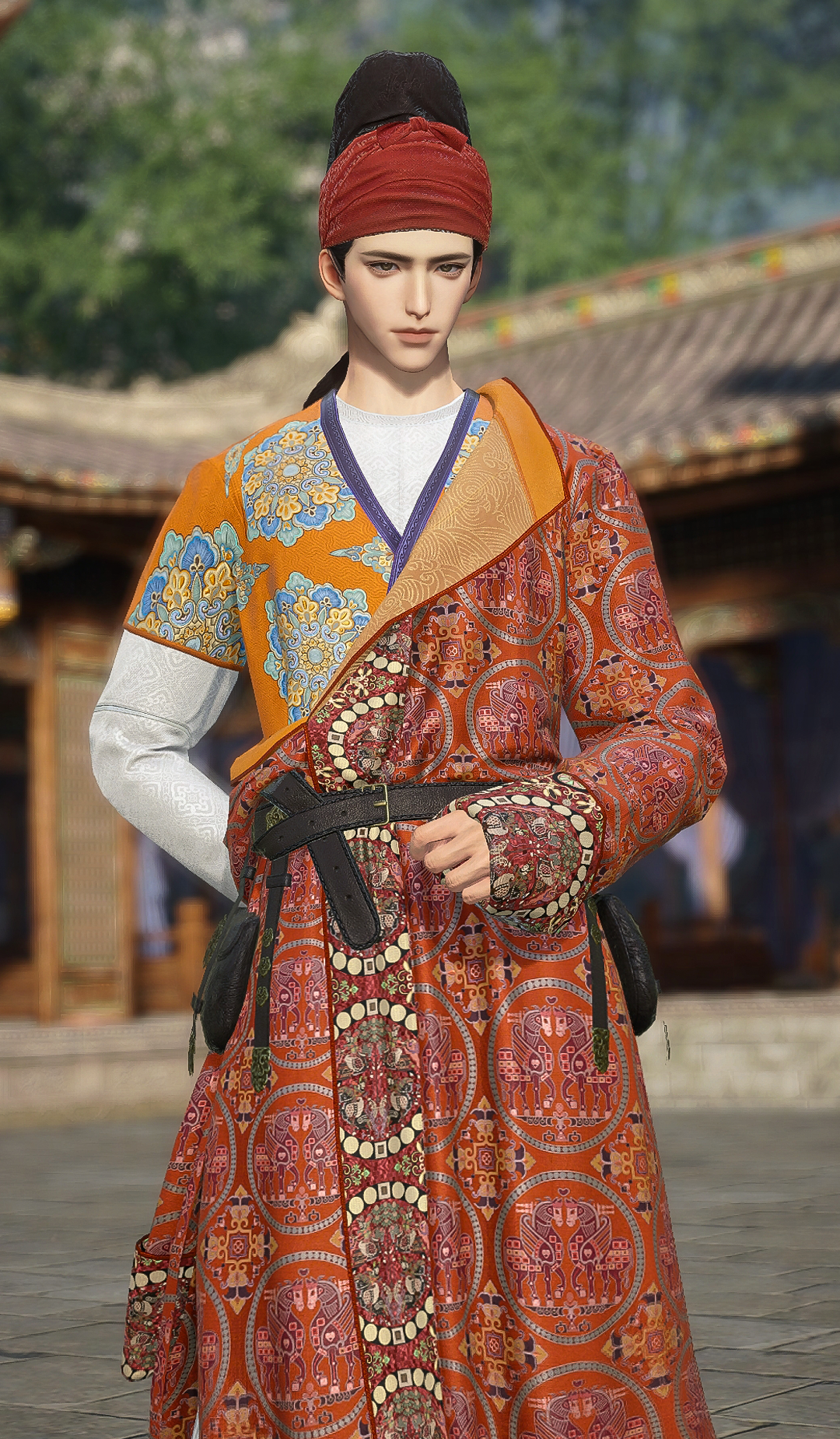 唐朝时期,男子多穿半臂。受胡风影响,穿衣多为窄袖。当时,极为流行半臂与缺胯衫搭配,腰间再配以革带。因此,在男款时装的设计形制考据上,依旧沿袭了唐朝时期的流行风尚。