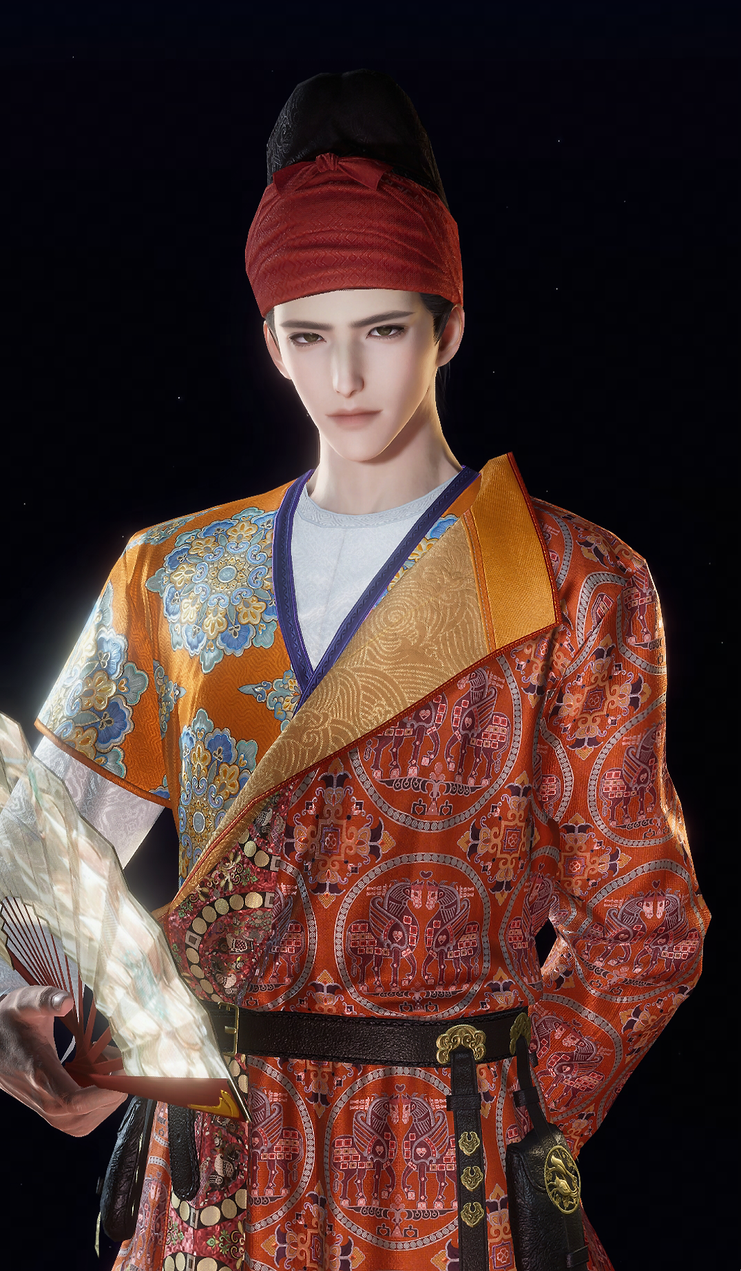 男款发型为简单的盘发,配以唐代经典的软脚幞头,行动时飘动尔雅,又显得干净利落,举手投足间尽显风流韵致。