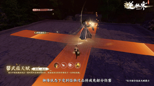 铁衣使用燕回风获得御锋状态,御锋状态下受到怪物攻击将减免部分伤害并获得御锋强化,使下一次拳系流派技能的位移能力得到加强并造成额外伤害。