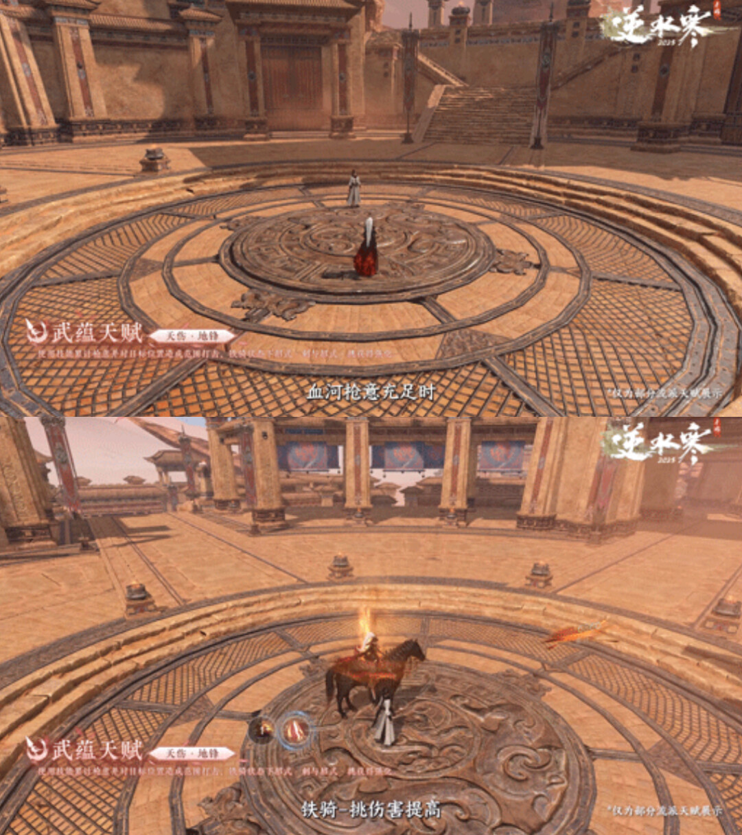 血河枪意充足时圆形范围伤害会触发枪阵打击并造成定身效果;铁骑-挑伤害提高,并附带击飞效果;铁骑-刺范围增大并附带眩晕效果。