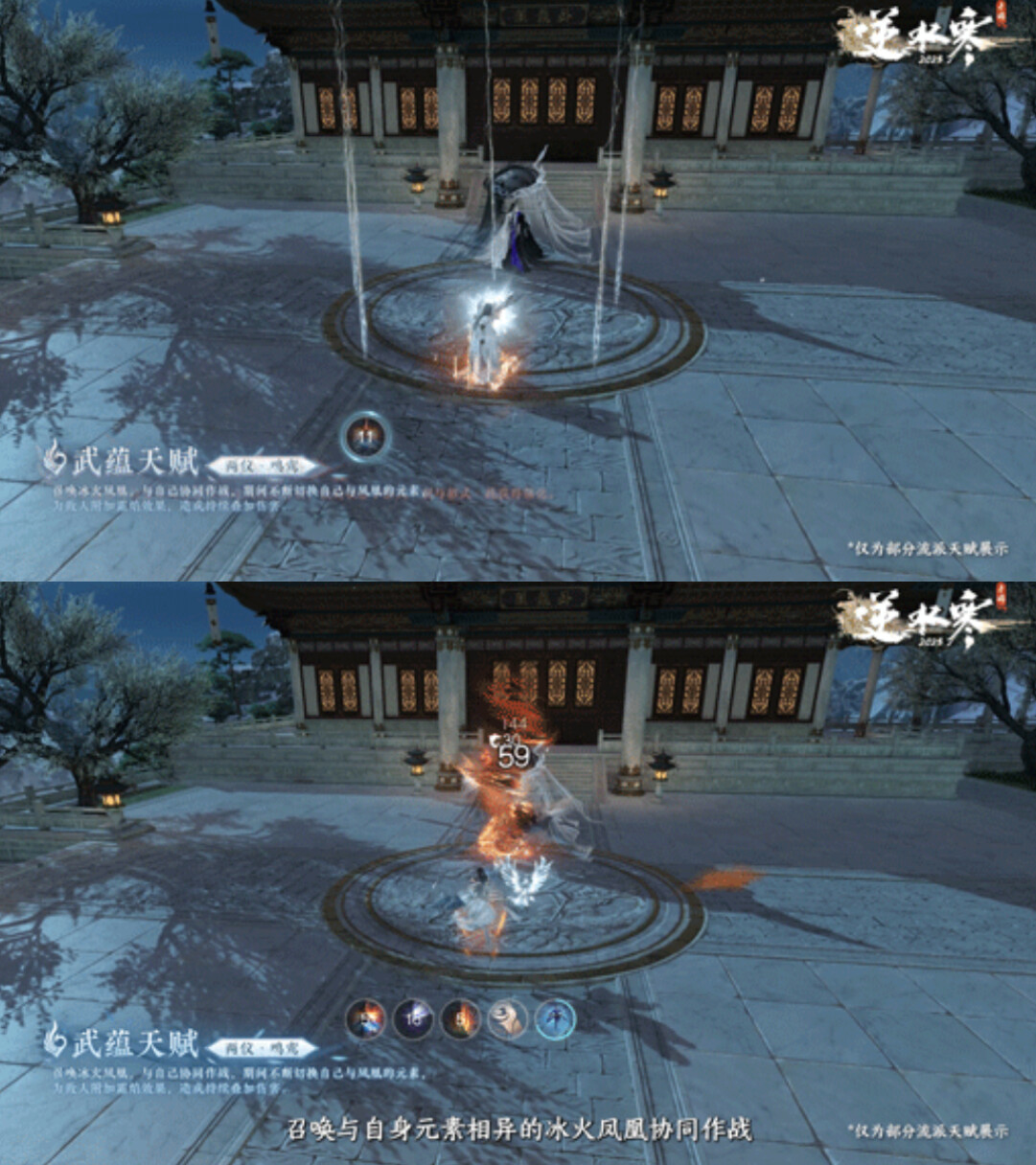 神相以音符为引,召唤与自身元素相异的冰火凤凰协同作战。期间持续切换自身与凤凰的元素,令敌人陷入霜焰状态,造成持续叠加伤害。
