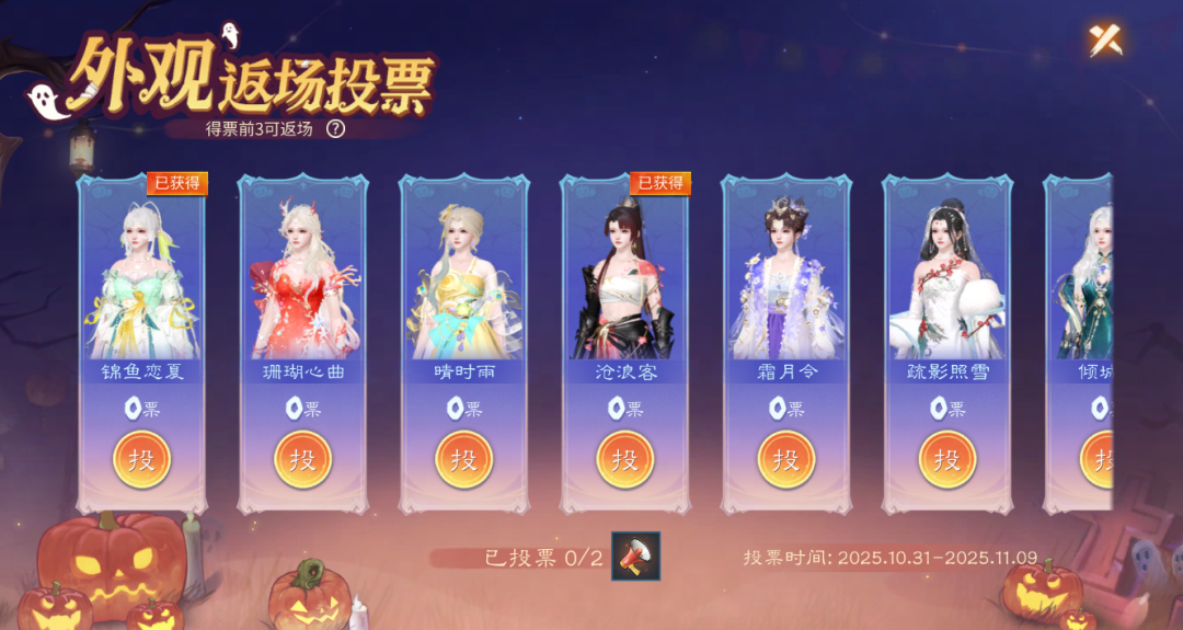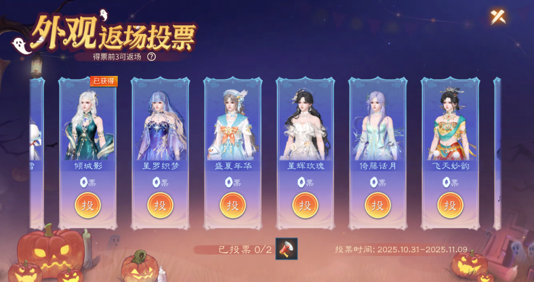 最终票数前三的时装将于11月10日上架灵玉商城。总票数排行1/2/3名的时装价格将分别为1588/1688/1788灵玉;
