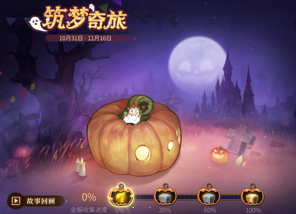 10月31日—11月16日【筑梦奇旅】活动期间,参与一条龙,师门任务,重温剧情,关宁校场,帮会大盗,帮会货运,宝图任务,即有机会获得香甜南瓜和回忆之叶~
