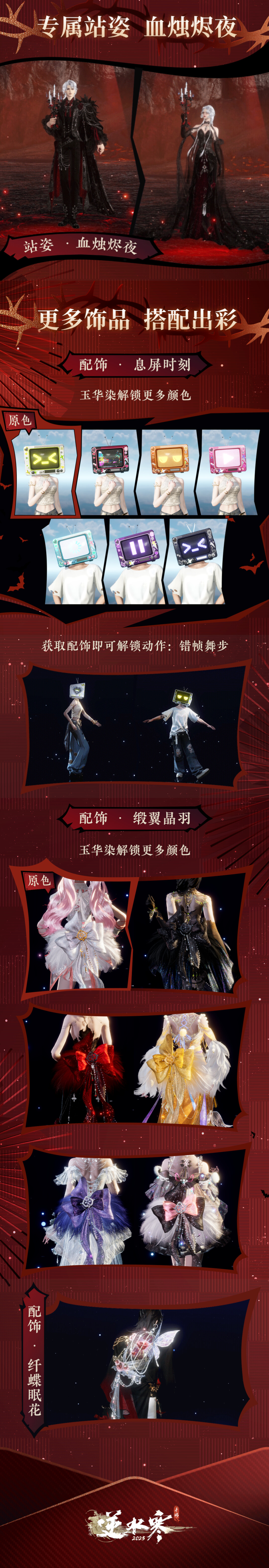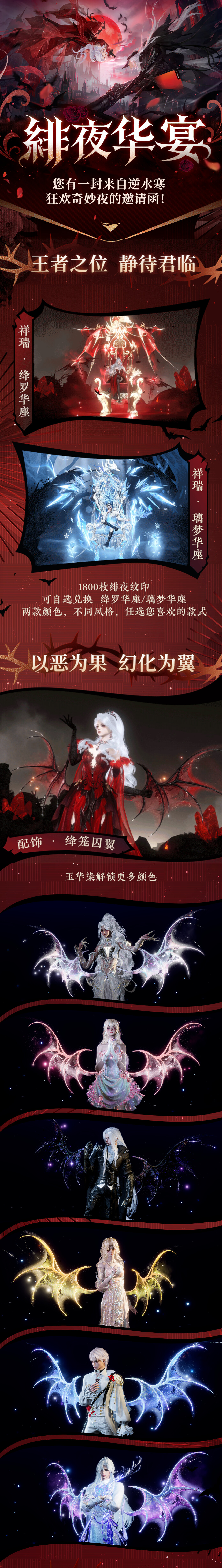 10月31日-12月5日,通过全新活动【绯夜华宴】便可将这两款全新祥瑞【绛罗华座】【璃梦华座】收入囊中。此外,参与此活动,您还有机会获得配饰【绛笼囚翼】、站姿【血烛烬夜】等绝美外观。