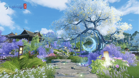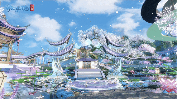 紫白主色调的园林宛如仙子居所,设计师于落樱缤纷中打造出如梦似幻的瑶池胜景。清雅中透着仙气,令人心醉神迷。