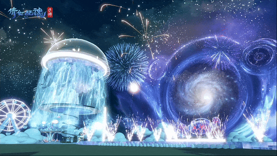 水母喷泉在夜色中闪烁着梦幻光芒,缤纷烟花绽放点亮夜空银河。烟花从正面看是圆的,从侧面看是恋人的脸~