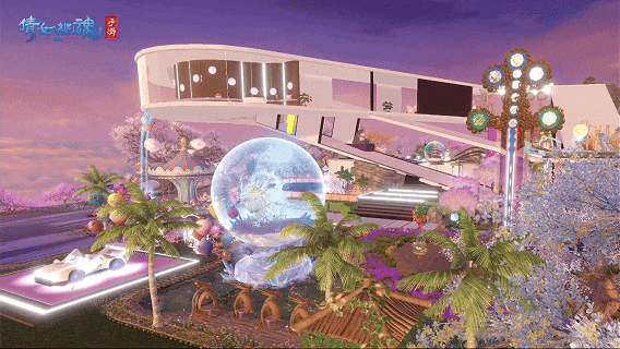 粉紫天空下,灵兽盘踞于巨大的水晶球中,如同这场浪漫派对的守护者。整座建筑在华灯与海风的映衬下,幻化为最华丽的舞台,正是举办一场顶级轰趴的绝佳所在。