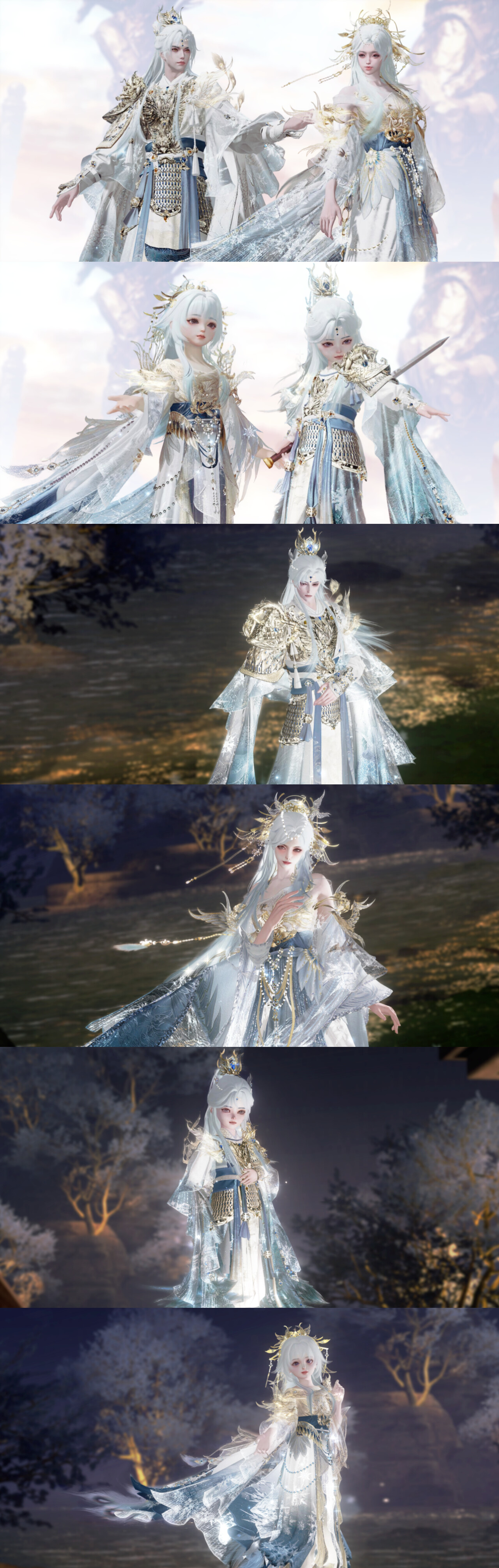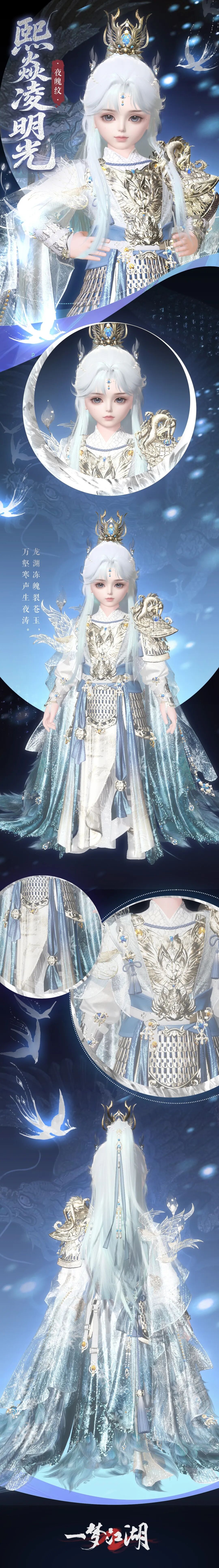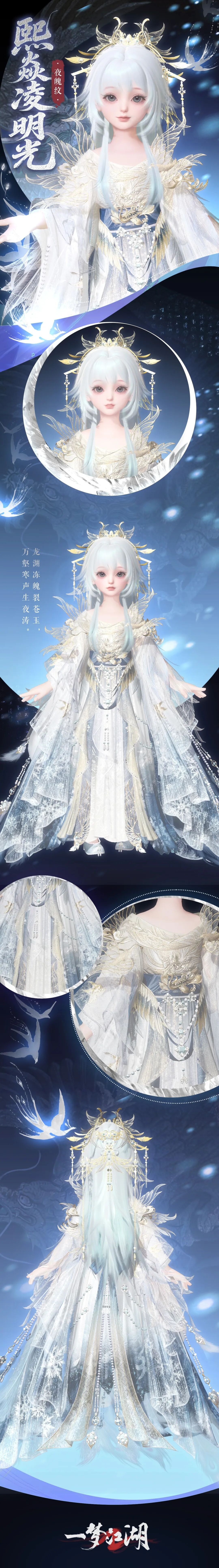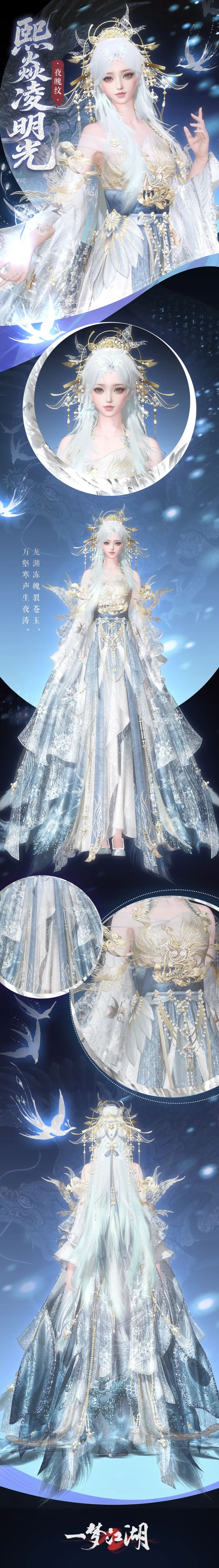 纹样·夜魄纹为时装·熙焱凌明光的异色纹样,将嘲风司掌的海啸天威凝作寒渊冰魄。取浪涛之蓝与极冰之白为经纬,在衣袂间铺开月下潮生的凛冽诗篇。白发如雪原初霁,发尾浸染海渊之蓝,似月华漫入寒潭。