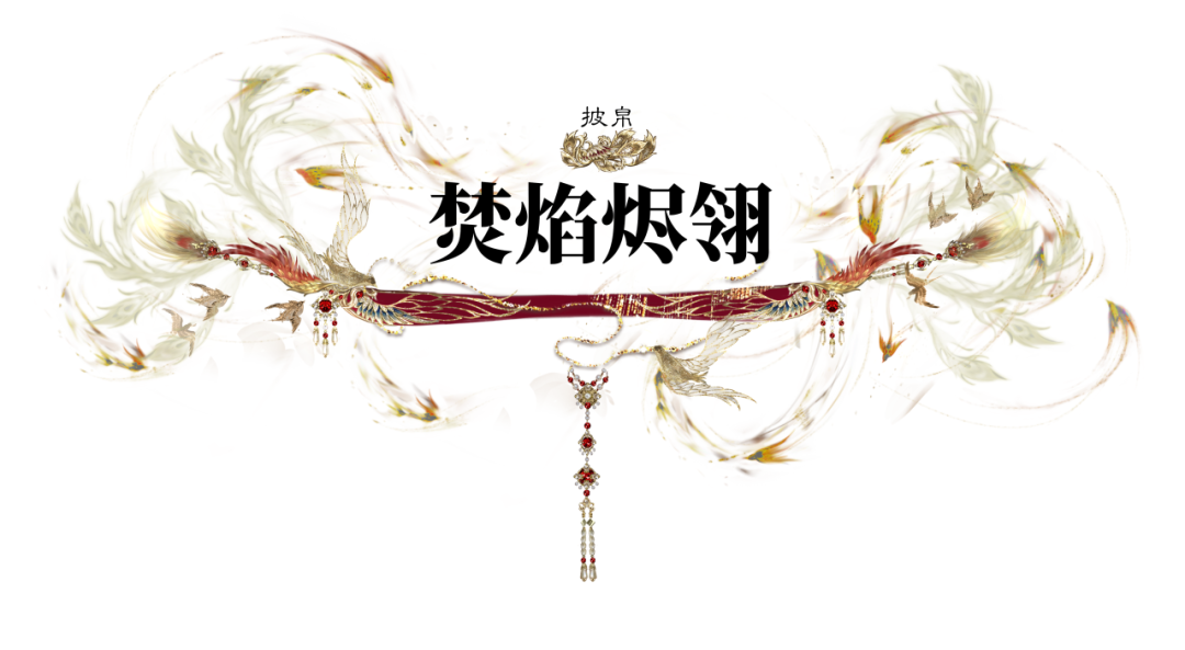 此披帛以万千凤凰绒羽叠织成底,表层浮动着飞鸟幻影。这些灵鸟周身萦绕金色光晕,时而聚作流火盘旋,时而散作星芒升腾,在帛带周围构筑出生生不息的轮回之象。远观如朝霞浸染层云,近看可见金翎脉络在赤帛上隐隐流动。