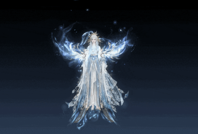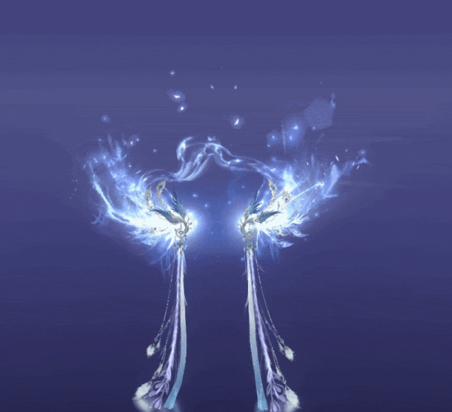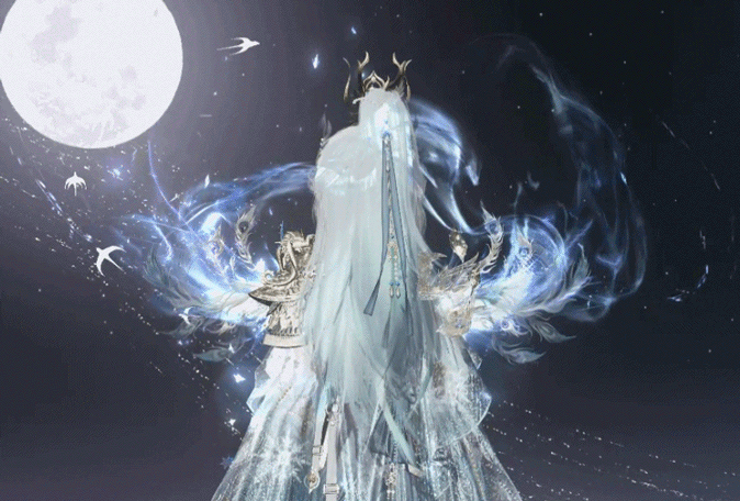 此披帛以冰蚕银为基底,白色为雪原初霁,蓝色若月照寒潭。自肩头凤翼处垂落七尺清辉,帛面浮动着冰鸾幻影,灵鸟携着霜雪环绕飞舞,在肩头羽翼间穿梭往来。当少侠抬臂转身,羽翼会随之舒展摇曳,冰晶折射出流转变幻的月晕。