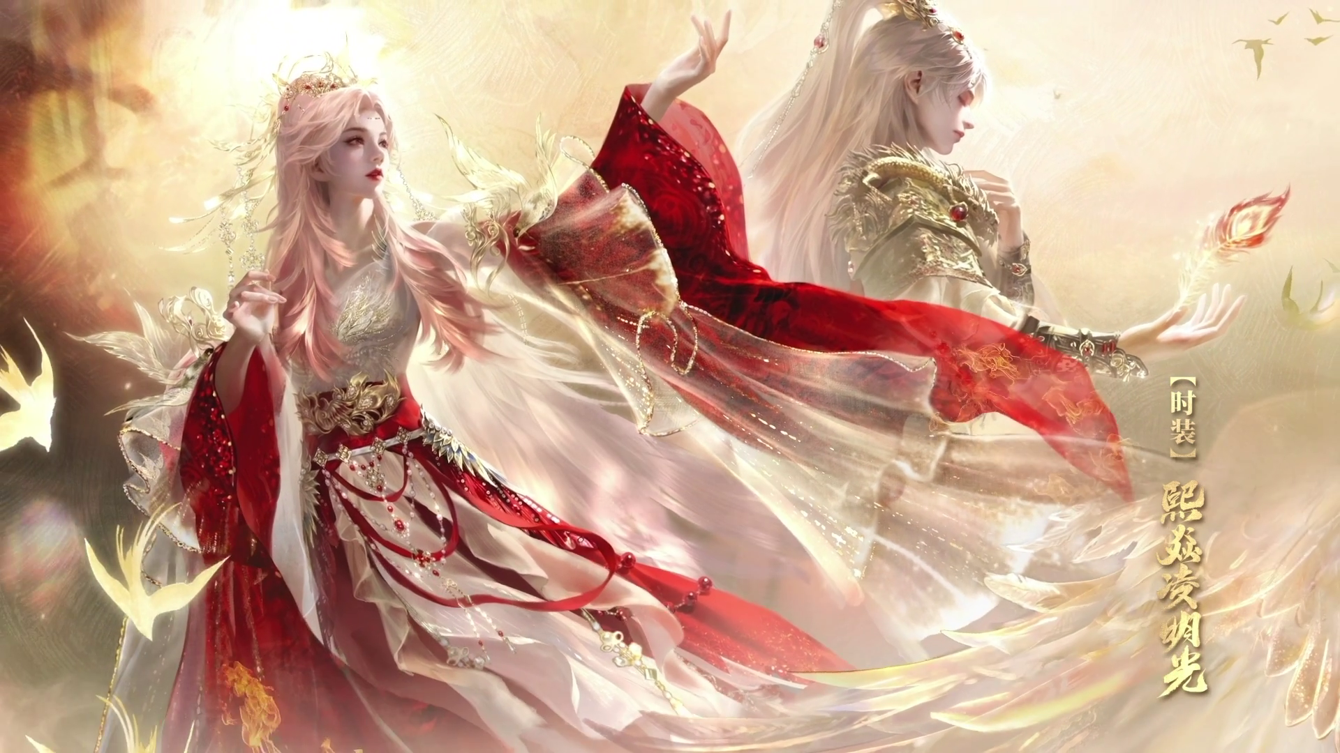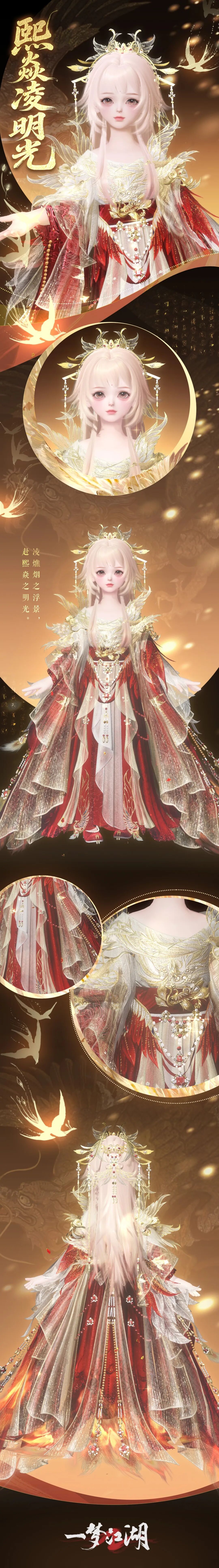 女款金羽曜云庭,以赤锦为底,若熔岩奔涌;金发如熔金倾泻,发尾浸染灼灼焰色,额间金环展翅化作飞凤衔珠,羽翼环鬓而生。正红织锦长裙曳地,裙袂龙纹暗涌似赤龙游走,裙摆层叠缀以凤凰金羽,每行一步皆绽流光。袖口金纱薄透,如嘲风双翼振空,扬手间如揽旭日初升,星火簌簌,恰似踏九霄天阶。