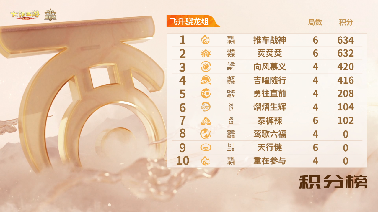 飞升骁龙组昨天的对战,由『相聚长安』服务器【烎烎烎】对阵『东胜神州』服务器【重在参与】,『与歌同行』服务器【向风慕义】对阵『莺歌燕舞』服务器【莺歌六福】,『东胜神州』服务器【推车战神】对阵『七十二变』服务器【天行健】,『2019』服务器【泰裤辣】对阵『2017』服务器【熠熠生辉】。