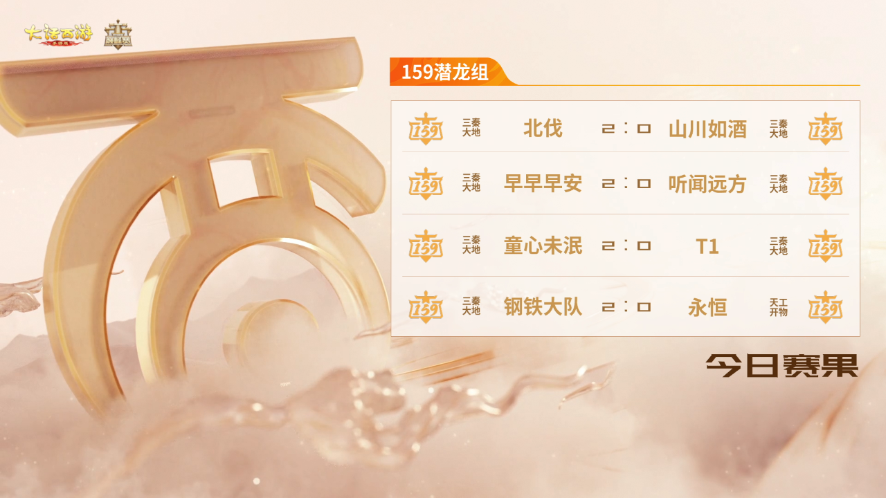 在昨天(11月7日)的对阵中,159潜龙组由三秦大地服务器『三秦大地』服务器【北伐】对战【山川如酒】,【早早早安】对战【听闻远方】,【童心未泯】对战【T1】,『三秦大地』服务器【钢铁大队】对战『天工开物』服务器【永恒】。