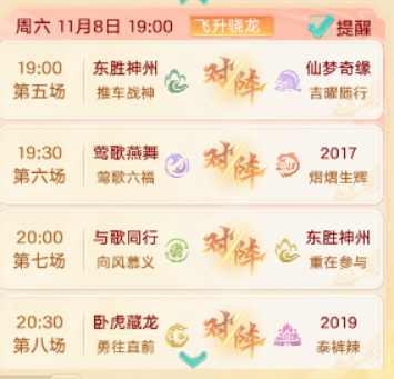 今日19:00,将迎来飞升骁龙组的对决,分别由『东胜神州』服务器【推车战神】对阵『仙梦奇缘』服务器【吉曜随行】,『莺歌燕舞』服务器【莺歌六福】对阵『2017』服务器【熠熠生辉】,『与歌同行』服务器【向风慕义】对阵『东胜神州』服务器【重在参与】,『卧虎藏龙』服务器【勇往直前】对阵『2019』服务器【泰裤辣】。