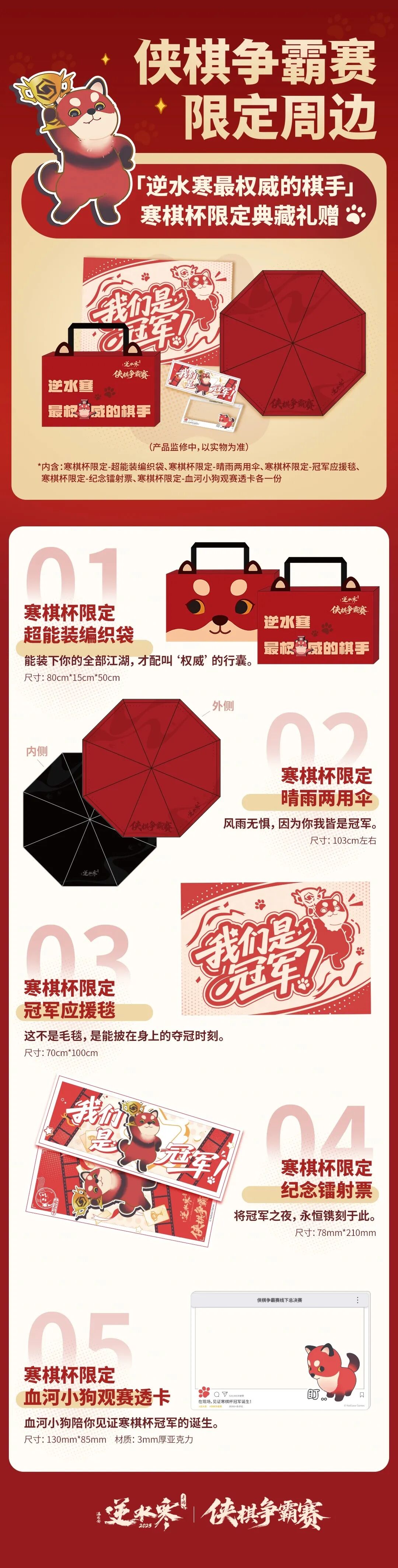 当然,福利也不能忘了!来到现场观赛的观众都能获得我们精心准备的限定周边:「逆水寒最权威的棋手」 寒棋杯限定典藏礼赠!现场还设有丰富的打卡互动活动,还能领走更多精美福利!