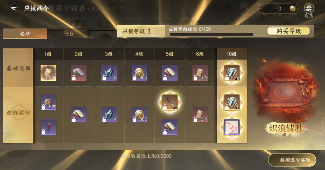 应援战令分为免费基础奖励与进阶奖励,您可花费【68元】来解锁进阶奖励,可收获全新棋盘【炽浪铸胜】、侠棋专属外观【攻击特效·驭雷·二阶】,还有铜钱、妆容、烫画、鉴石神凿(2个可交易,1个绑定)、更多竞猜币等。