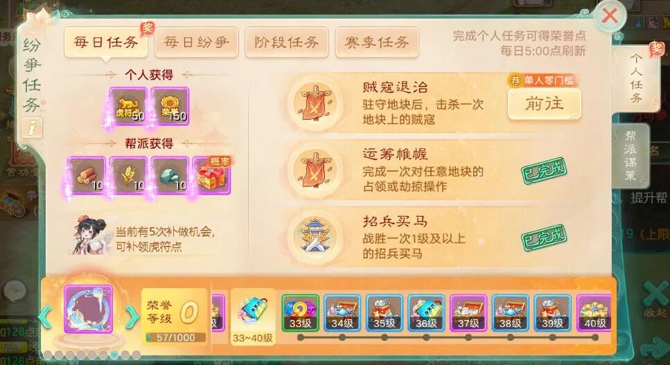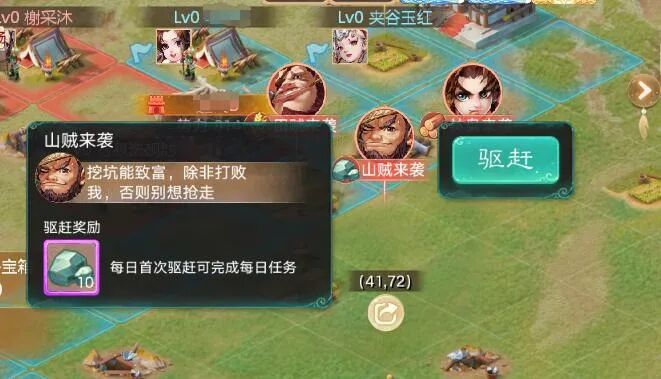 每日任务新增单人任务:贼寇退治,少侠可单人或组队消灭地块上的贼寇,完成每日任务并获取个人奖励的同时,可以为帮派收集木头,粮食或石料资源!推荐完成!