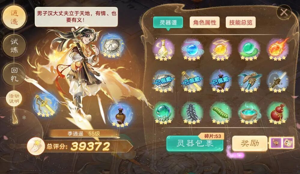 1)通过活动界面可查看、佩戴、升级灵器提升“李逍遥”属性及评分获得强力技能;