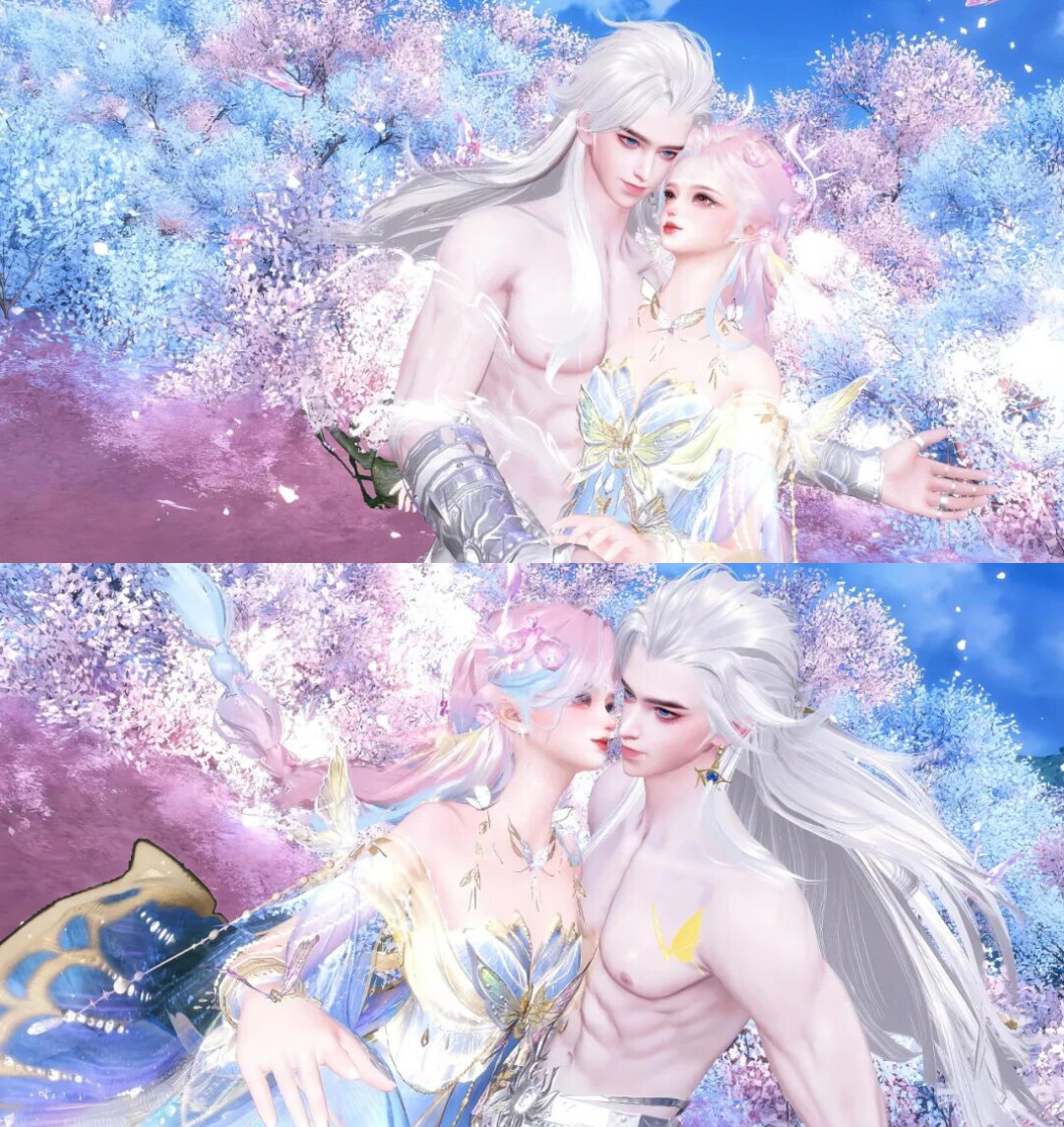 人鱼姬的粉蓝渐变,宛如将朝霞与深海同时织入衣料。两人并肩立于漫天樱霞之下,周身流转着鲛人般的华贵神秘,与身后的樱花海融为一体,甜蜜又浪漫。请问二位的喜宴摆在哪一殿?菌菌就算自备板凳也要去坐主桌!