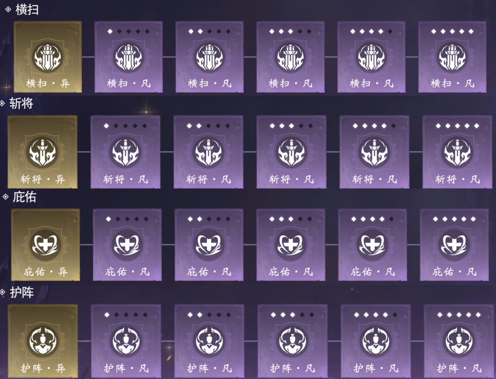 少侠可以在四个方向上培养自己,分别是:斩将(精英增伤)、横扫(小怪增伤)、庇佑(奶妈治疗提升)、护阵(坦克减伤),少侠可四种方案中选择其一。