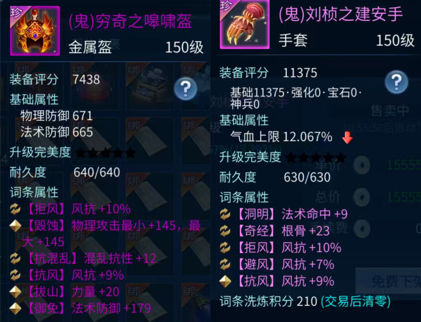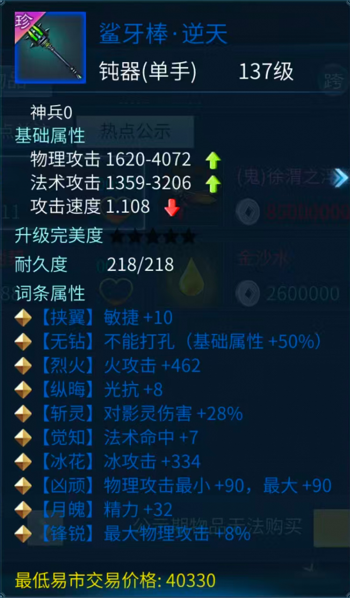 除了后天洗炼之外,也不乏 “偶然天成” 的优质装备。这件隐藏在易市的137级蓝装钝器,不仅是逆天10词条的基础,还携带了无钻、最大物攻加成及斩灵词条,并且仅售价111w银两,热衷收藏的小伙伴,不妨留意一下!