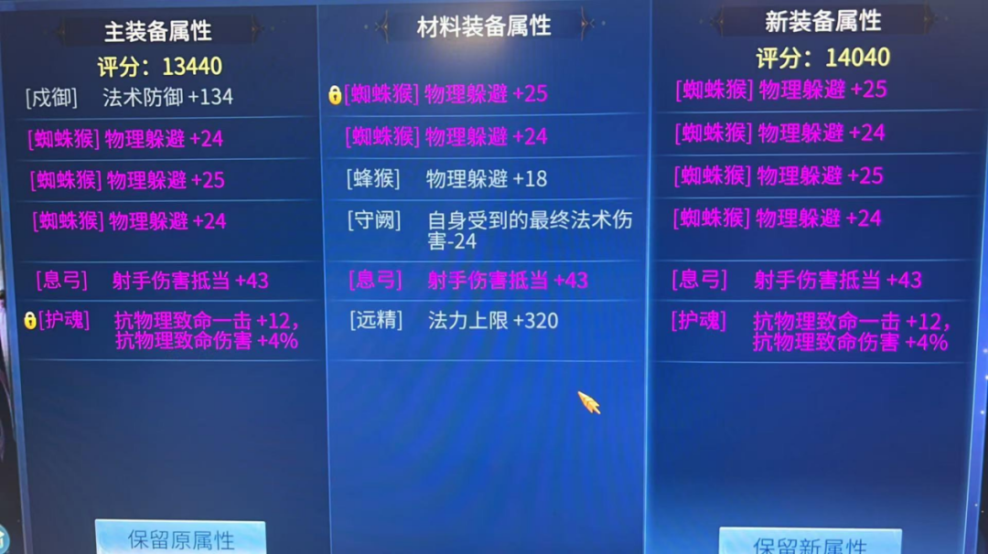 此件护心镜的熔炼运气相当不错!号主在左侧主装备缺少一条固定物躲的情况下,选择用材料装备固定三物躲+射手抵当进行熔炼,直接得到了这件4条高数值物躲+射手抵当与抗物理致命的毕业级护心镜。