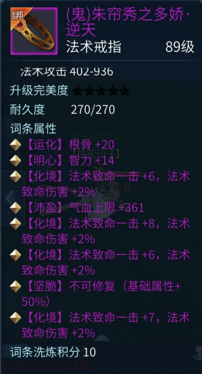快来瞧快来看,10积分就能拿下逆天鬼装法术戒指!号主仅用一次洗炼,就将这件原生89级鬼装法术戒指洗出了逆天属性,并且随机位附带3条法术致命与不修词条,放眼整个三界,可有欧皇敢来一战!