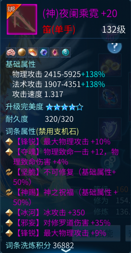这件137级的单手鬼装笛,固定词条拥有最大+双五十,已然十分优秀,而后又洗出了7绝最大物理攻击+19%的数值,堪称利器!
