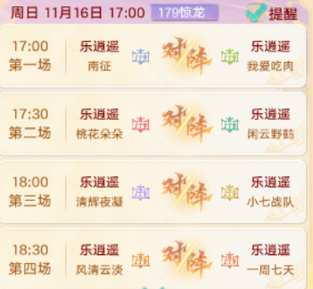 179惊龙组的对战将由『乐逍遥』服务器【南征】对阵【我爱吃肉】,【桃花朵朵】对阵【闲云野鹤】、【清辉夜凝】对阵【小七战队】,【风清云淡】对阵【一周七天】。