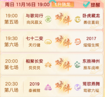 飞升骁龙组将于19:00开启对战,赛事将由『与歌同行』服务器【向风慕义】对阵『2019』服务器【泰裤辣】,『相聚长安』服务器【烎烎烎】对阵『2017』服务器【熠熠生辉】,『七十二变』服务器【天行健】对阵『莺歌燕舞』服务器【莺歌六福】,『仙梦奇缘』服务器【吉曜随行】对阵『东胜神州』服务器【重在参与】。