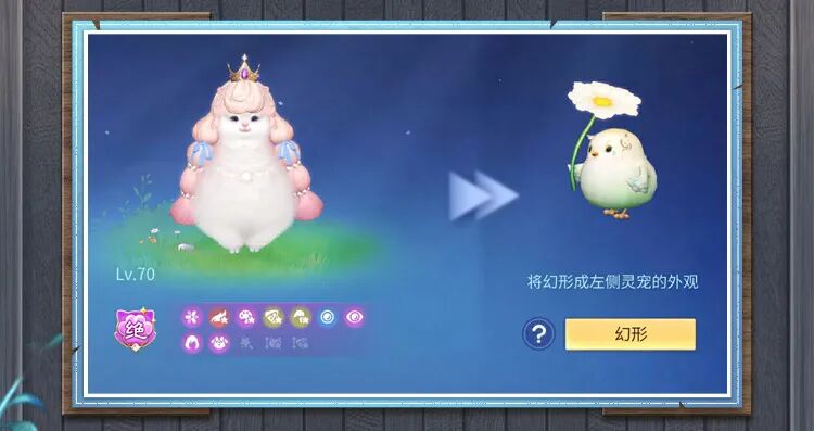 任何灵兽都可通过幻形功能无消耗转化为点亮幻身标识灵宠的外观,点亮幻身标识的灵宠可通过幻形将自身外观提供给其他灵兽使用,旧灵兽也可通过幻形转换为新灵宠的外观哦~