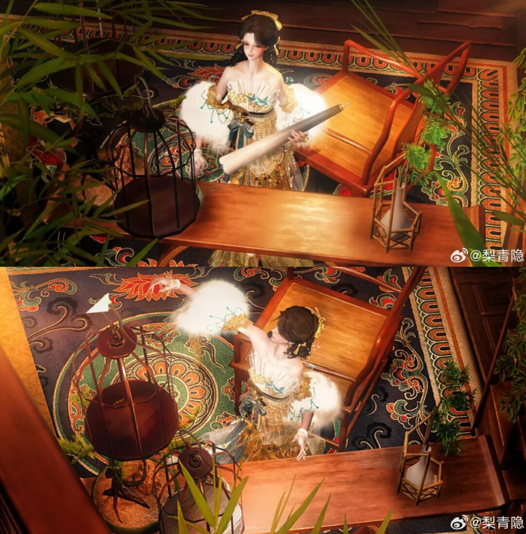 羽翼不附金枝,振翅即生风云。少侠@梨青隐身着一袭时装·泮塘锦纶静立于阁中,东方纹样与西式剪裁在她衣上悄然相融,身前木案鸟笼空悬。