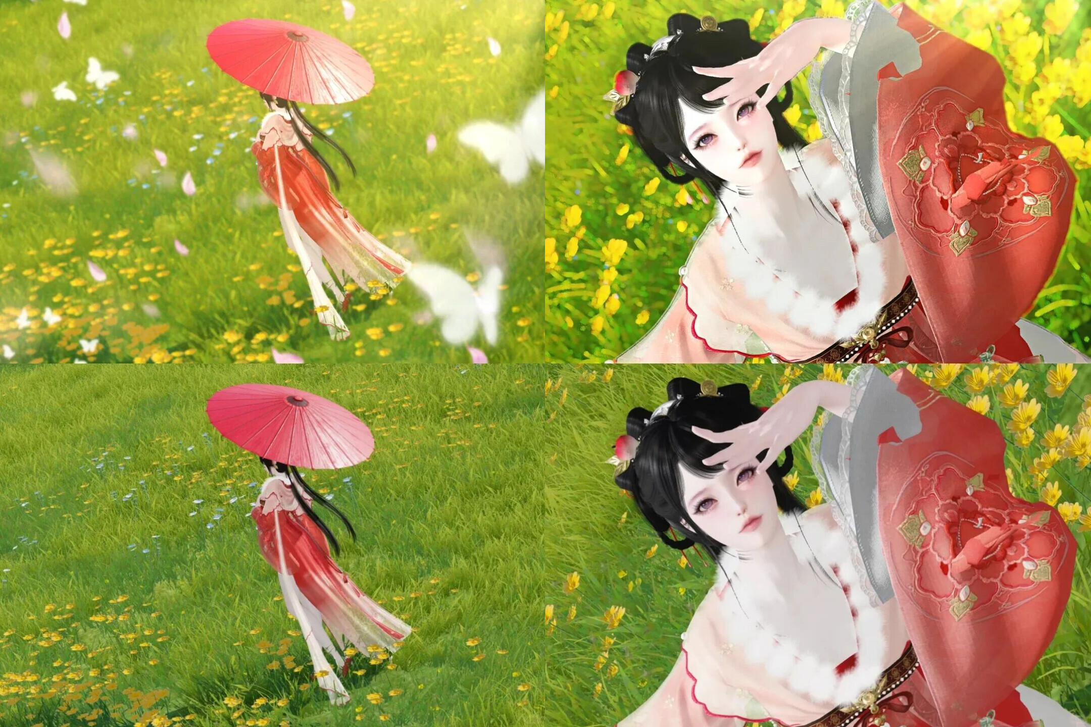 转瞬她已跃入芳菲草地,粉裳翩跹似东风卷起一树海棠。蓬袖展合间漾开蜜糖色的甜香,裙摆旋出层层花浪,漫天蝴蝶为少侠驻足~
