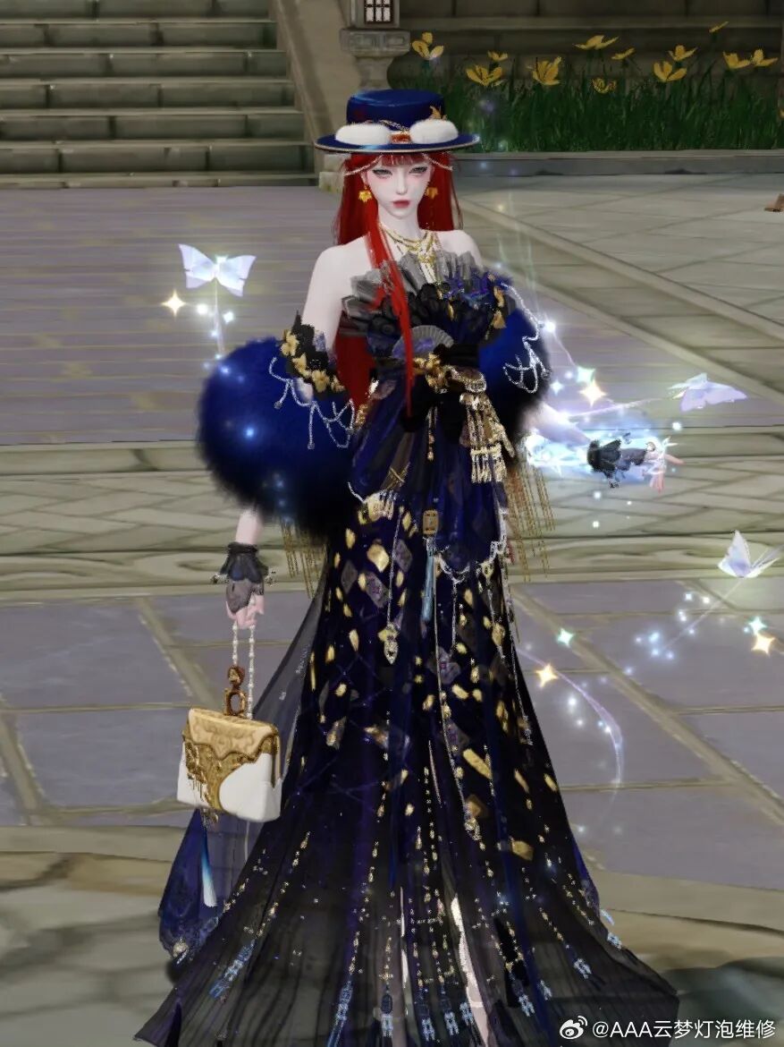少侠将这一袭时装·泮塘锦纶染作烟紫,缎面泛着星河初醒时的微光。红发如灼灼枫叶落于肩头,与紫色礼帽交织出绮丽的情调。若问高雅何以具象,便是此刻——红发紫裳,一步一生莲。