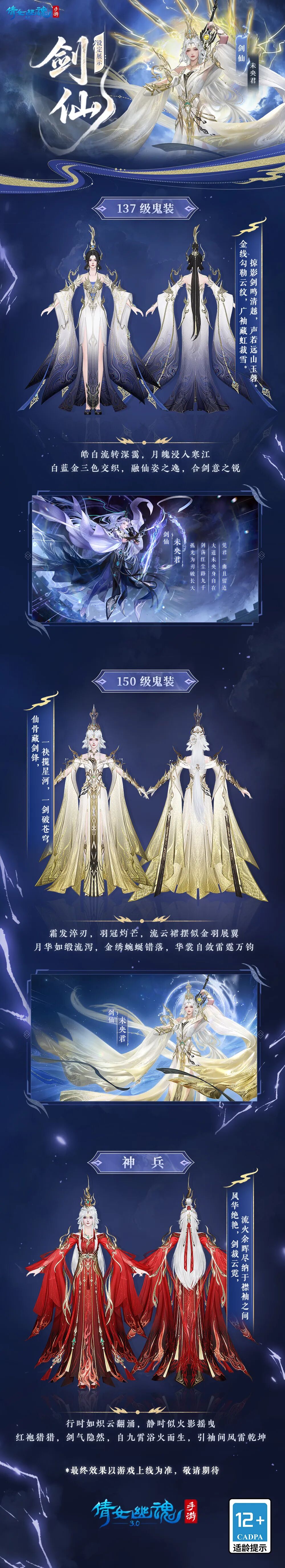 这两套亦是美得各有千秋,137级鬼装外观有如寒江月魄,仙姿清越;神兵装则如凤凰浴火重生,风华绝艳,喜欢女剑仙的小伙伴有福了!