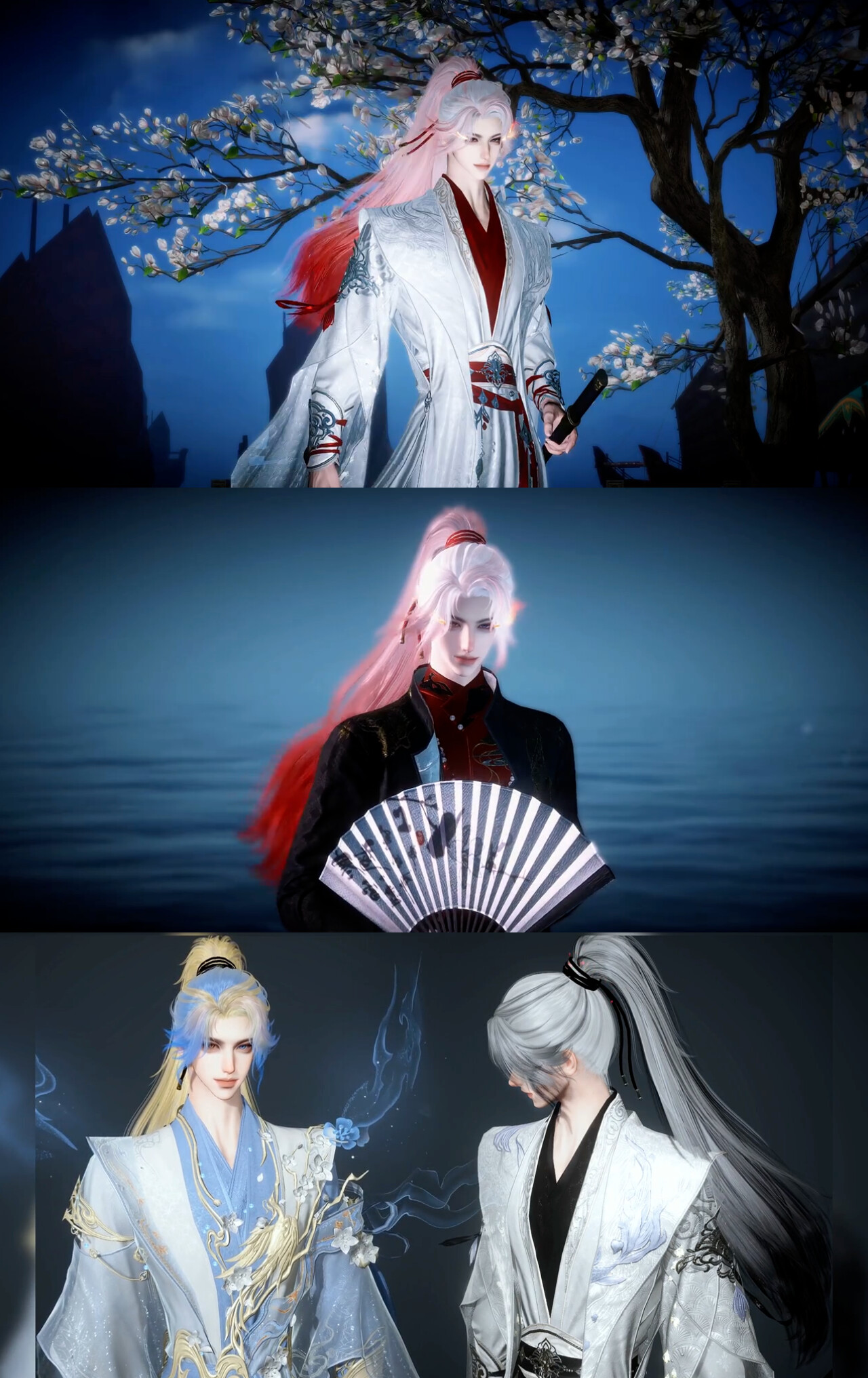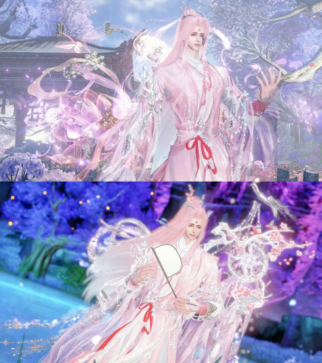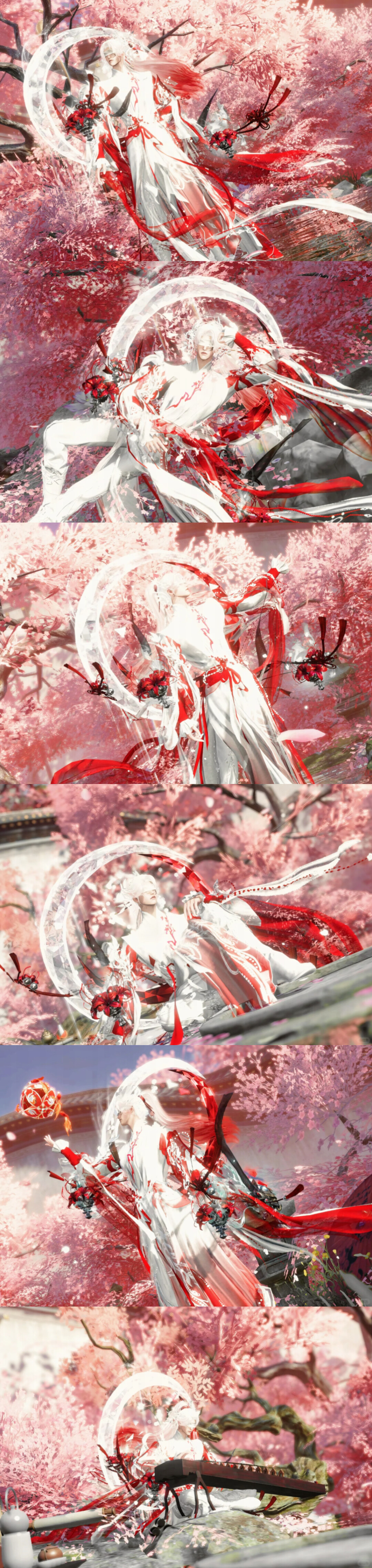 以漫天绯红的桃花林为幕,白衣红饰的仙君立于其中,渐变的发丝随风舒展,清冷又艳绝。