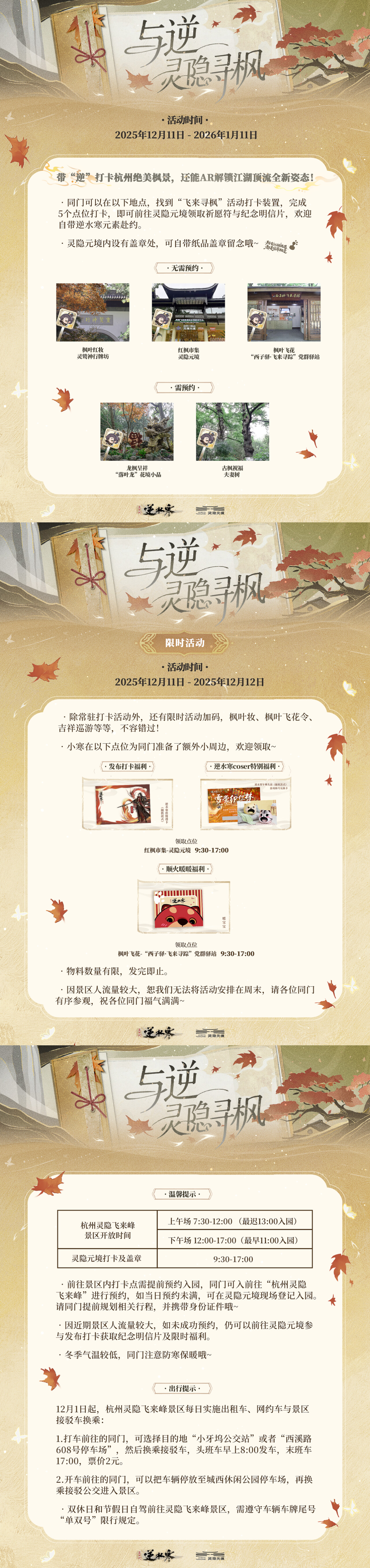12月11日起,逆水寒邀请同门共赴灵隐寻枫!带上手边的逆水寒元素,打卡最美枫叶盛景,还能偶遇大宋顶流。更有枫叶妆、枫叶飞花令、吉祥巡游等限时体验,小寒也为大家备下小小心意,期待同门与逆一起出枫叶大片!