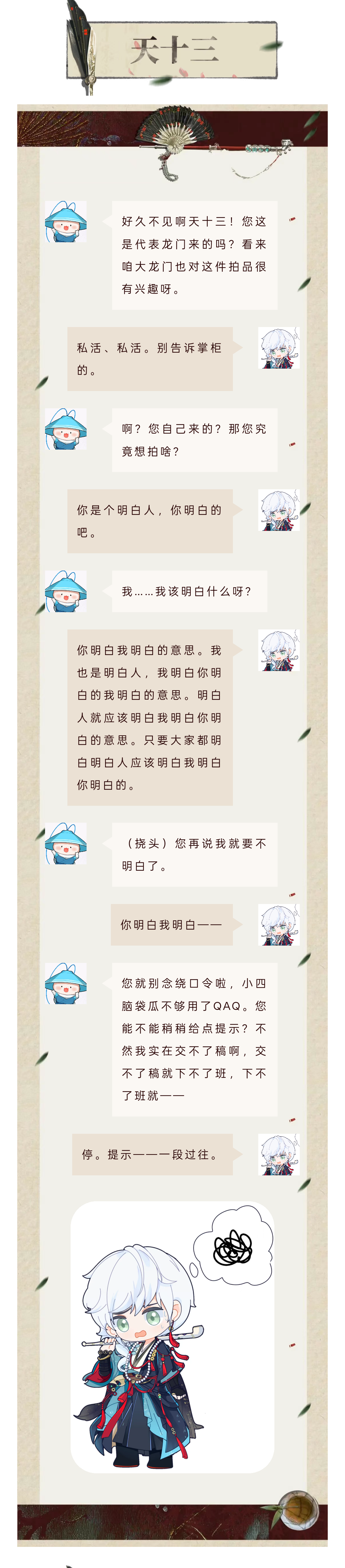 1月,主线剧情新篇【无天无地】即将揭开, 心思各异的大人物们不约而同前来竞拍,究竟是什么稀世之物,值得他们大动干戈?