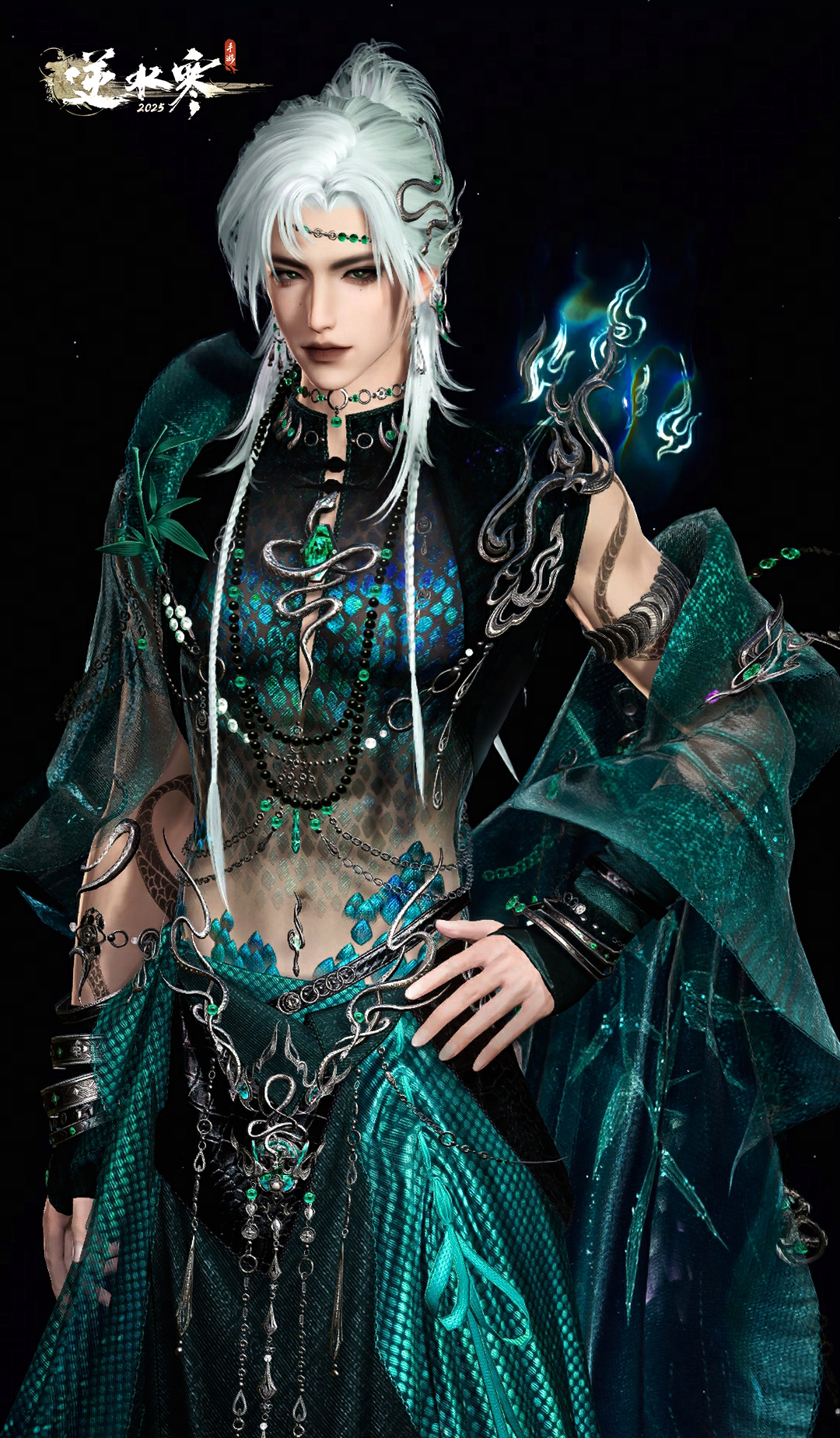 男款时装在设计上,极具蛇性。紧身渐变色的上衣,将腰腹若隐若现的露出,极具巧思。身上依旧缀着青色的蛇麟,随着呼吸与转动,光泽如水波般在青黑之间流淌,冷冽而神秘。