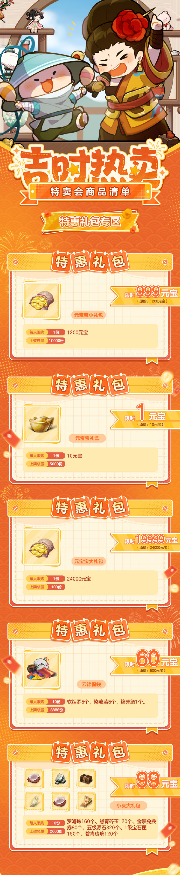 本次吉时热卖期间,若少侠两场热卖累计消费元宝达到99/4000/10000/25000元宝,将逐步解锁下列四档豪华尊享礼的购买资格: