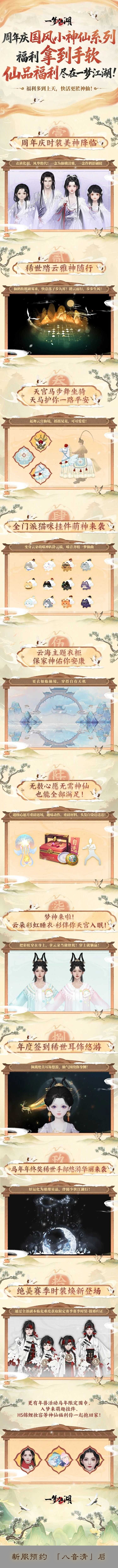 八载江湖梦,幸有君同行。为答谢少侠们八年来的一路相伴,周年庆国风小神仙系列福利来袭,铺开一场“仙气十足”、又别具古风韵味的新年盛宴。绝美羽衣时装、稀世仙鹤踏云、天宫马步舞坐骑、门派小梦神挂件、全新天宫衣柜、萌趣云朵睡衣等全套小神仙外观,以及赛季福利、年度签到仙气耳饰、年度绝美手部悠游、马年限定围巾、入梦来萌趣挂件、H5锦鲤妆容等神仙福利,愿这份精心备下、拿到手软的仙品好礼,陪伴少侠云游天宫奇景,共迎祥瑞新春!