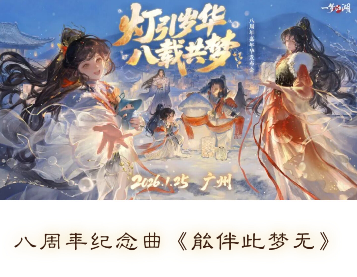 八载岁月,一梦同舟。2026年1月25日,一梦江湖八周年嘉年华将落地广东广州,与你在线下相逢回顾来时路,展望第八年的新旅途——江湖如长夜,你我原是散落四方的萤光,因缘相逢,以情为焰,终聚作温暖灯海;天地亦如雪,苍茫寒暖皆是岁月,正是这共行风雪中的步履,将凛冽淬成相守的温热。