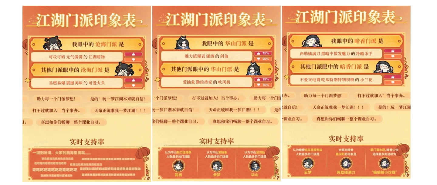 各大门派的性格、行为和标签,在你的心里究竟是什么样的呢?和其他少侠眼里的TA们,又有着哪些不同?是“刻板印象”还是“一针见血”,少侠测试生成的门派印象记录会说明一切!