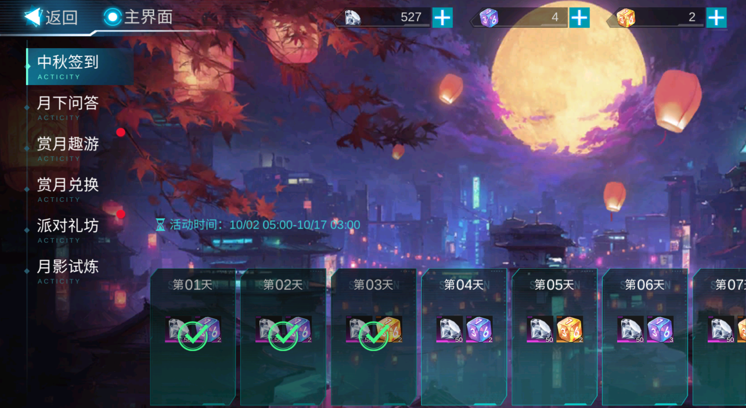 每日签到,即可轻松领取丰厚奖励。活动期间获得的专属道具,可在赏月趣游赚取月圆值,月圆值在赏月商店兑换心仪奖励。