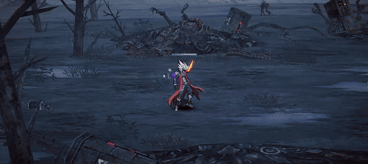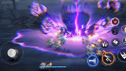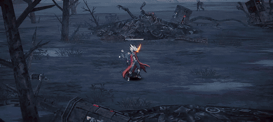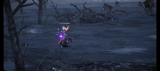 一身黑紫配色的服饰,搭配银灰机甲风装饰,头发和武器都缠绕着幽蓝色火焰特效,手持一杆流光质感的长柄武器,战斗中会手持幽蓝火焰缠绕的长柄武器,招式带着炫酷的能量特效。