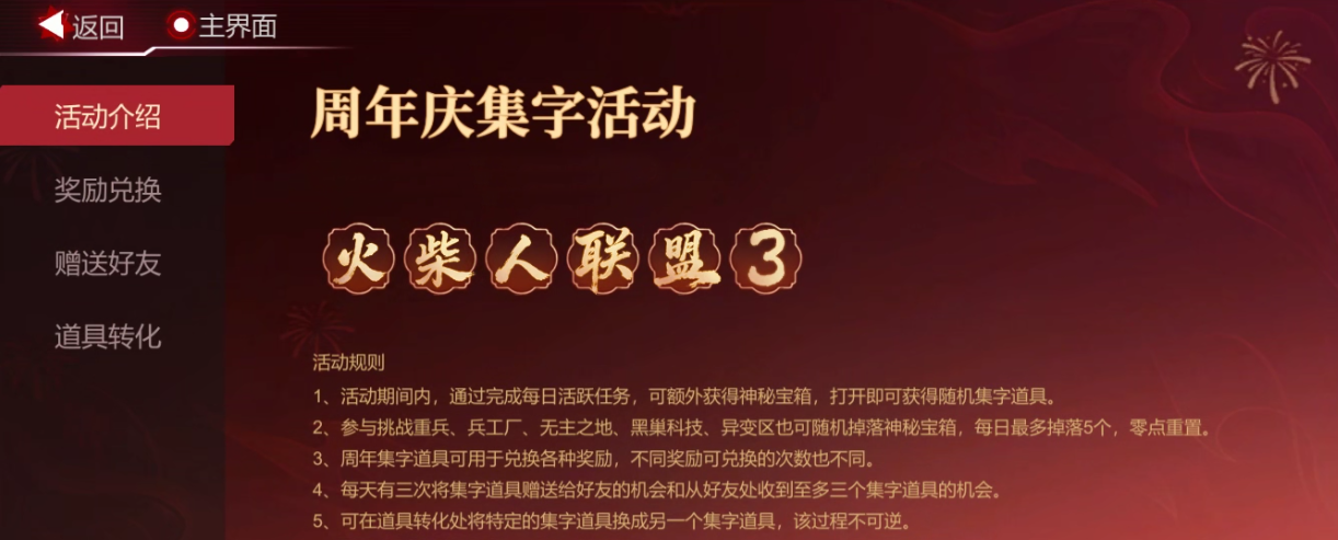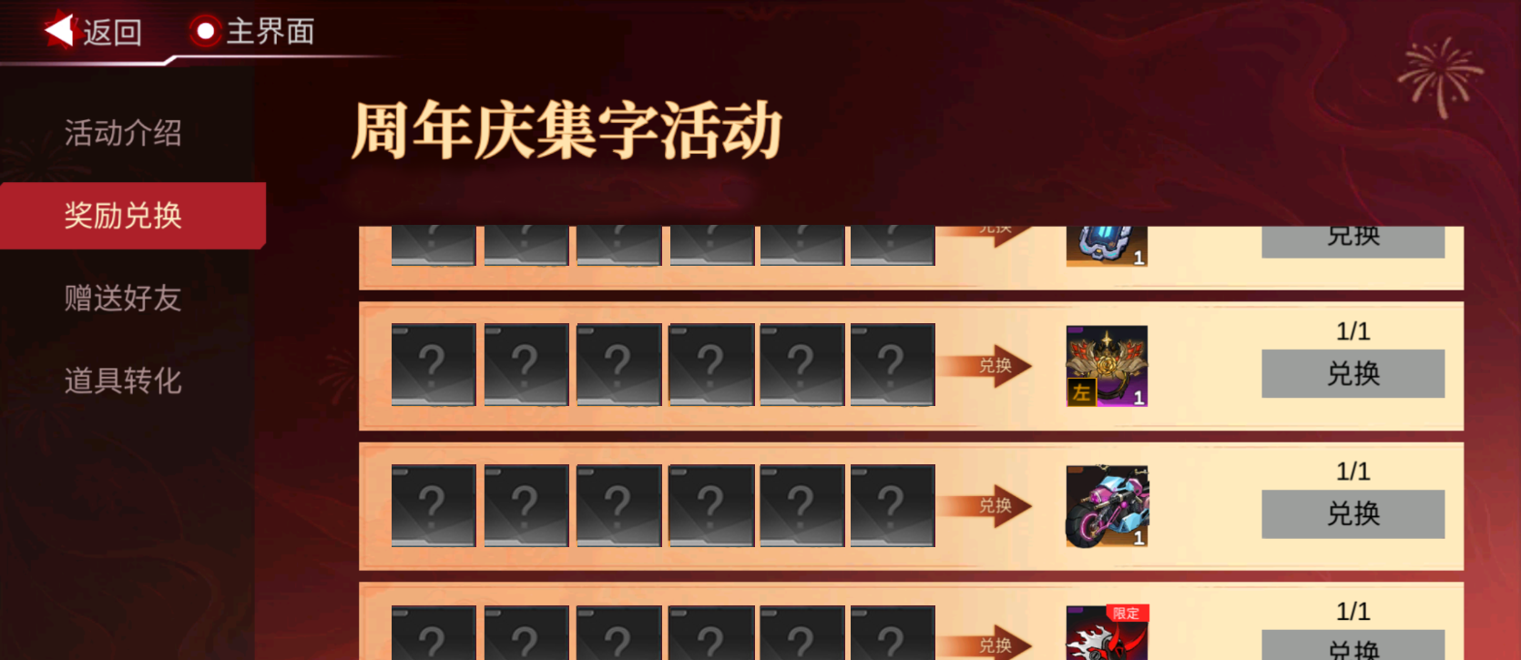 活动期间通过参与各个副本,可随机掉落神秘宝箱,宝箱可开出限定道具,使用限定道具可以进行兑换奖励,可兑换周年纪念戒指、周年紫色时装、周年限定载具和其他的珍贵材料。