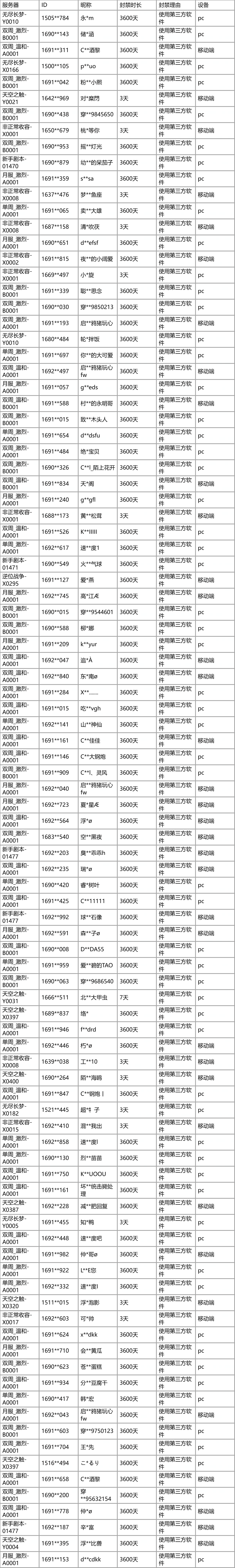 以下为近期因违规处罚情节较重的玩家公示名单,相关角色已进行复核,违规属实。如有任何疑问,请通过游戏内客服进行反馈。
